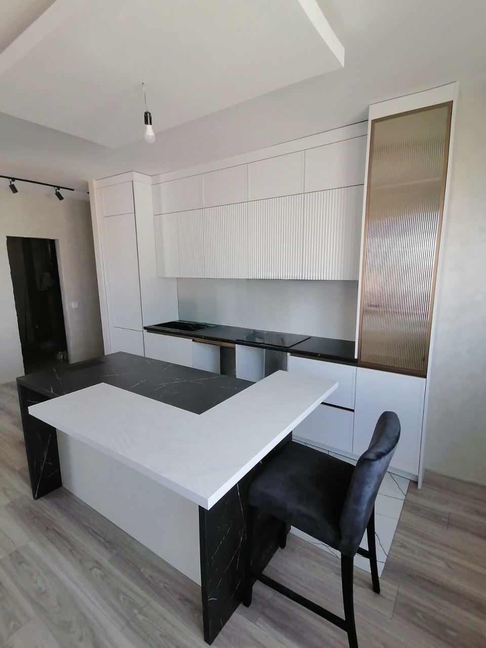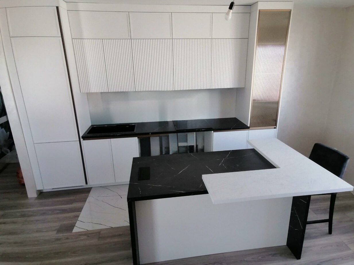Кухня с фрезерованными «волнами» и стеклянными фасадами