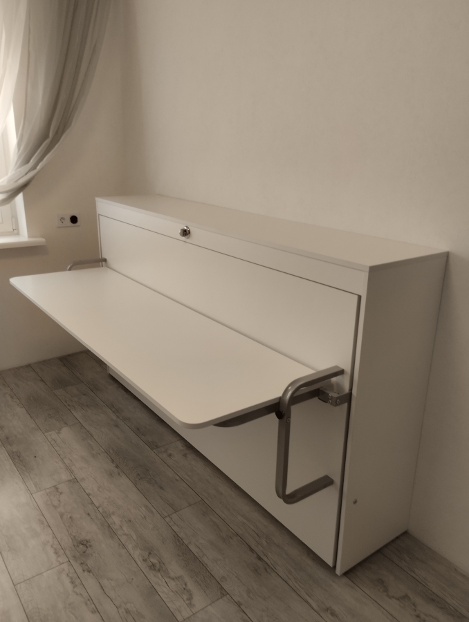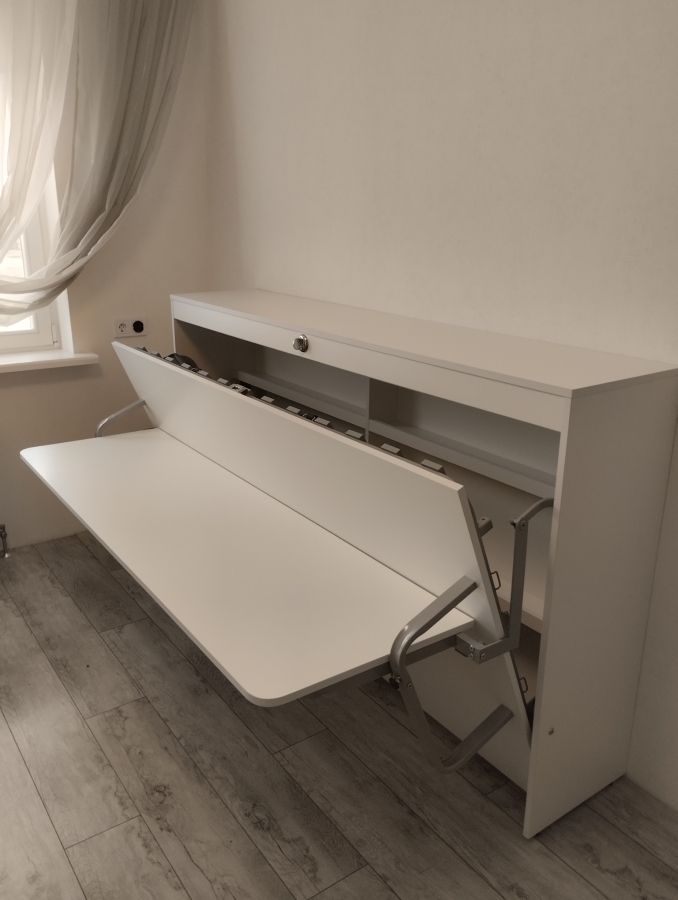 Данная модель кровати оснащена столом, который при опускании кровати все время остается в горизонтальном положении, что позволяет не убирать вещи при раскладывании кровати.